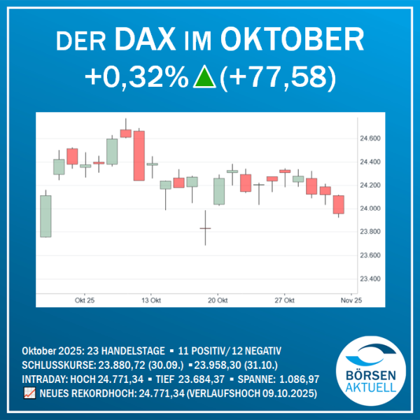 Im Oktober schloss der DAX bei 23.958,30 Punkten und damit +0,32 Prozent (+77,58 Punkte) höher als im Vormonat. Von den 23 Handelstagen dominierten 12 negative gegenüber 11 positiven. Der DAX erzielte in diesem Monat ein Intraday-Hoch von 24.771,34 Punkten und damit ein neues Rekordhoch am 9. Oktober 2025. Das Verlaufstief lag bei 23.684,37, was eine Handelsspanne von 1.086,97 Punkten bedeutet. Seit Jahresbeginn liegt der Index nun mit 20,34 Prozent bzw. 4.049,16 Punkten im Plus.