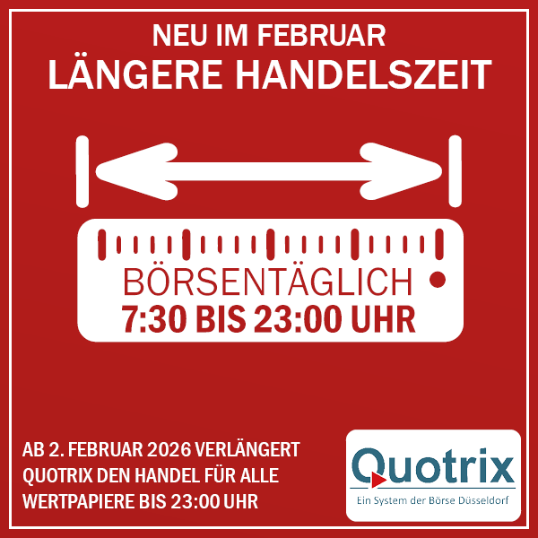 Der Handel findet regulär Montag bis Freitag im Makler-gestützten Handel an der Börse Düsseldorf von 8:00 bis 22:00 Uhr und im elektronischen Handelssystem Quotrix (Market Maker) von 7:30 bis 22:00 Uhr statt.